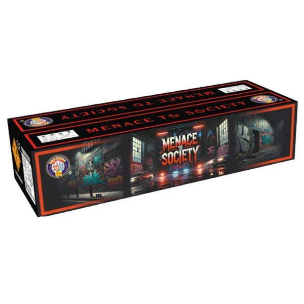 Menace to Society is a powerful 7-segment, 246-shot compound firework manufactured by Brothers Pyrotechnics. It features vibrant effects including golden willows, red ghost bursts, and a thunderous double-salute fanned finale. With a mix of 25mm and 30mm tubes, it lasts for 2 minutes and 20 seconds. This really is one of the largest and most impressive consumer fireworks available for serious enthusiasts and events.
